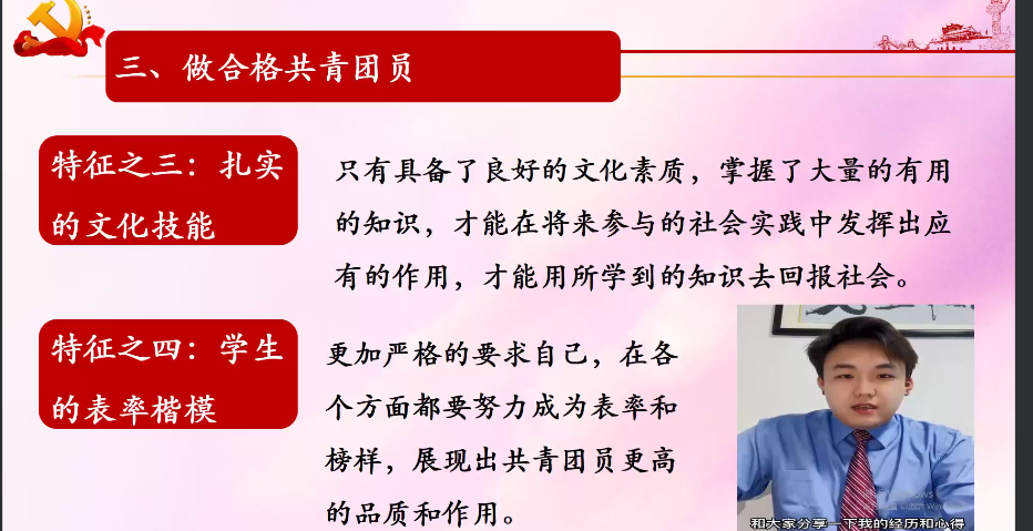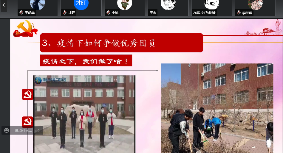 团课中提出如何在疫情形势下做优秀共青团员。崔校长向同学们提出做新时代合格共青团员应具备四个特征:1.坚定的共产主义理想。2.优秀的道德品质。3.扎实的文化技能。4.学生的表率楷模。通过分享疫情封校以来学生们的表现和所做、所感来激励所有共青团员要向优秀的团员学习,并引发广大共青团员思考如何提升自身综合素质,青春就要永担责任、敢于挑战。